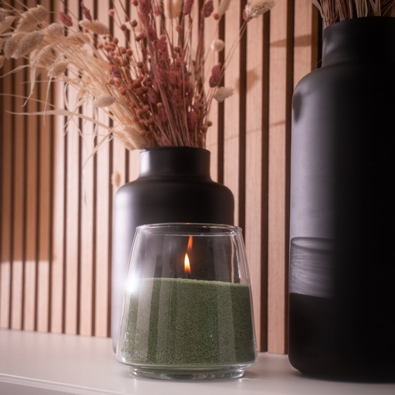 Schenk en vul je kaarsenhouder met SandWax en schud lichtjes zodat het kaarsenzand zich gelijkmatig verdeelt. Dit is de perfecte basis voor een schone, rustige vlam.