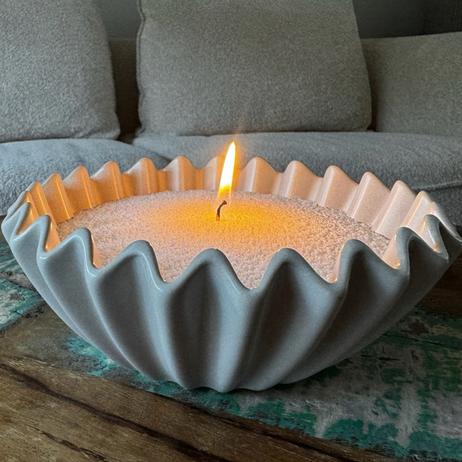 De keramieken kaarsenschaal brengt rust en eenvoud samen in één zachte vorm. Het matte, subtiel witte keramiek voelt kalm en puur aan in je interieur. En laat de kleuren SandWax kaarsenzand mooi tot leven komen. De golvende rand geeft een organische, serene uitstraling. Een rustige blikvanger die je tafel, kast of cosy hoekje direct warmer maakt.